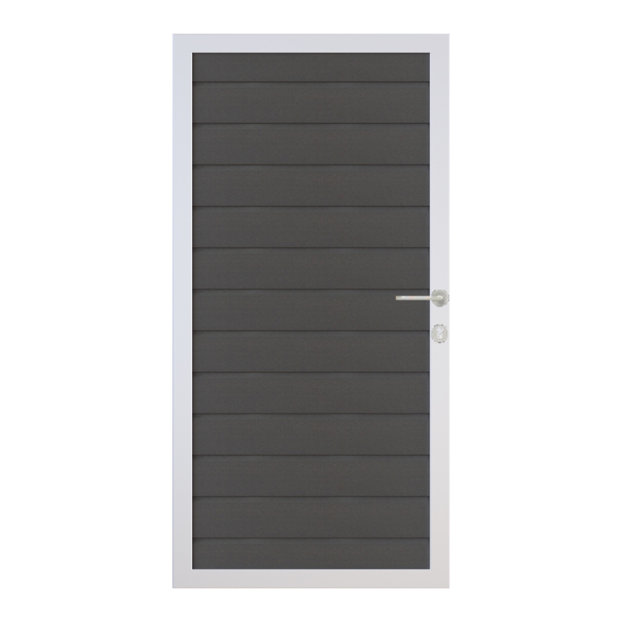 Dieses Multi Fence Torelement zeichnet sich durch einen robusten Aluminium-Rahmen aus und ist mit waagerecht verlaufenden Hohlkammer-Profilen aus BPC gefüllt, die diesem Tor seine einzigartige Optik verleihen. Darüber hinaus ist es hervorzuheben, dass dieses Tor fertigungsbedingt sowohl in DIN links als auch in DIN rechts montiert werden kann. Dank seiner hellgrauen Farbe ist es ein stilvoller Blickfang und fügt sich harmonisch in das Gesamtbild jedes Gartens ein.