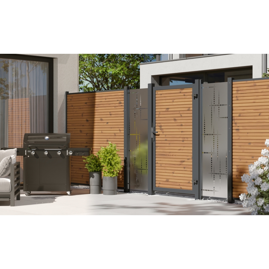 Das Herzstück des Sets bilden 18 Nut-Feder-Profile mit einer Stärke von 20 mm und einer Breite von 100 mm. An den Enden sorgen Aluminiumelemente, die pulverbeschichtet sind, für zusätzliche Stabilität. Die Abschlussleisten aus Aluminium sind sowohl im unteren als auch im oberen Profil integriert und geben dem Zaunfeld einen stimmigen und modernen Look.