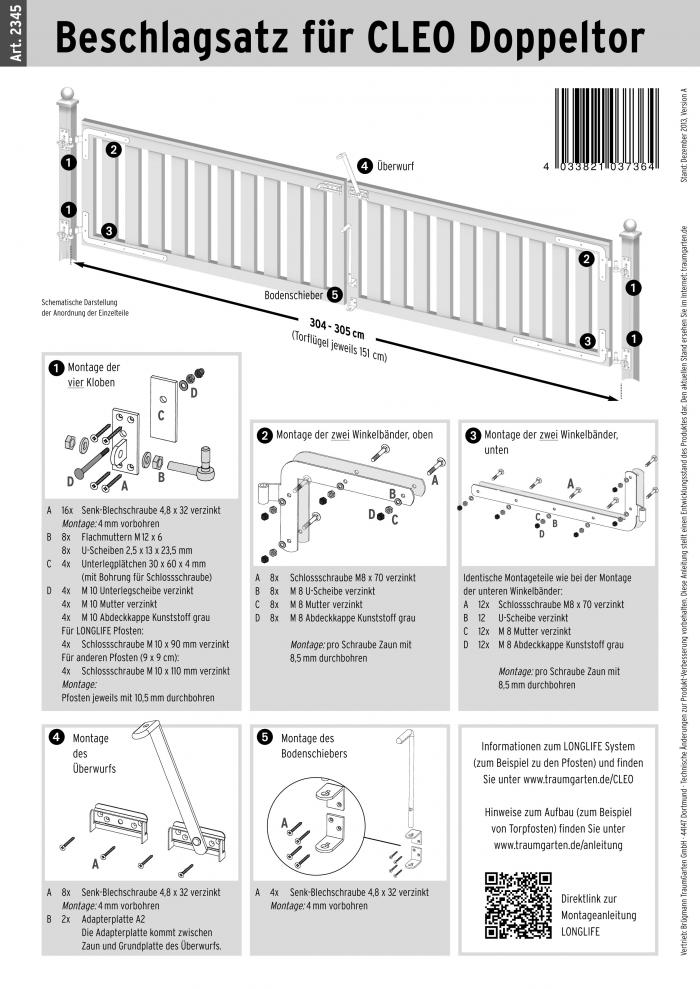 Der Beschlagsatz für das Doppeltor Cleo besteht aus den in der Montageanleitung beschriebenen Beschlägen. Pfosten, Pfostenkappen und Türflügel gehören nicht zum Lieferumfang.
