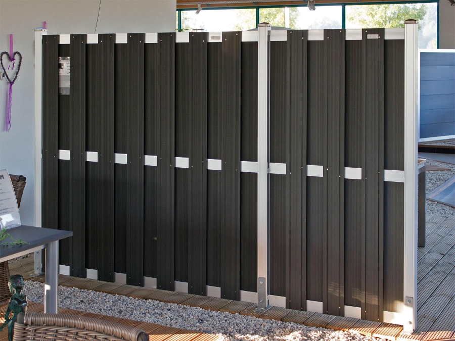 Diese Zaunanlage basiert auf den Sichtschutzzäunen aus der Zaunserie Elephant Design WPC. Die Zaunelemente bestehen aus senkrecht verlaufenden Lamellen aus WPC (Wood-Polymer-Composite) und waagerecht angeordneten Riegeln aus Aluminium.