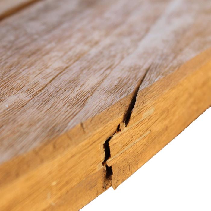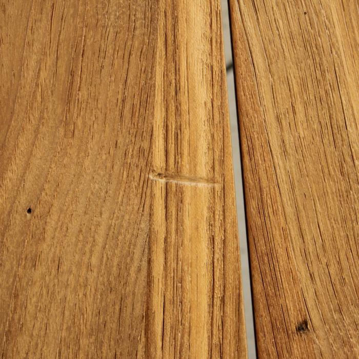 Auch Rissbildung und Spalten im Kantenbereich können gerade bei recyceltem Teak verstärkt vorkommen. Hier können sowohl die Kopfseiten, als auch die Längskanten von Bauteilen betroffen sein.