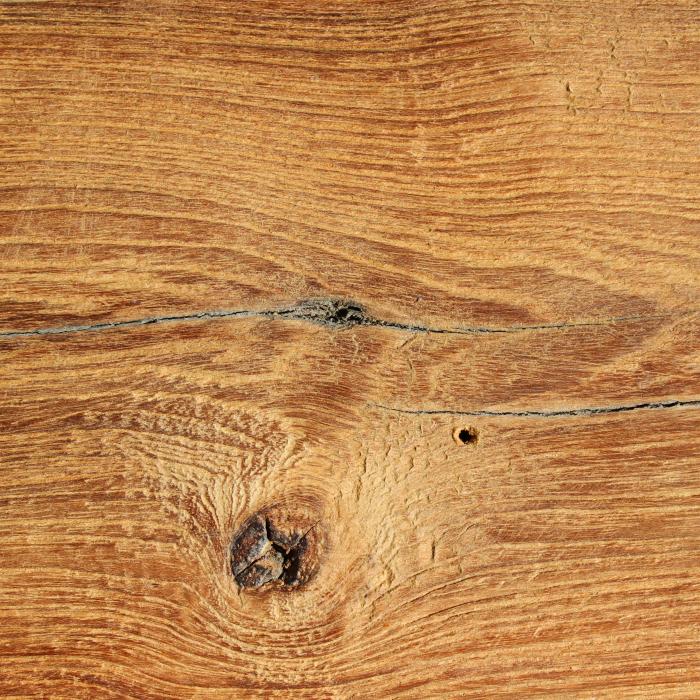 Zu den Gebrauchsspuren der vorherigen Nutzung zählt beispielsweise das abgebildete Loch eines Nagels. Auch die gezeigte Rissbildung ist typisch für recyceltes Teak.