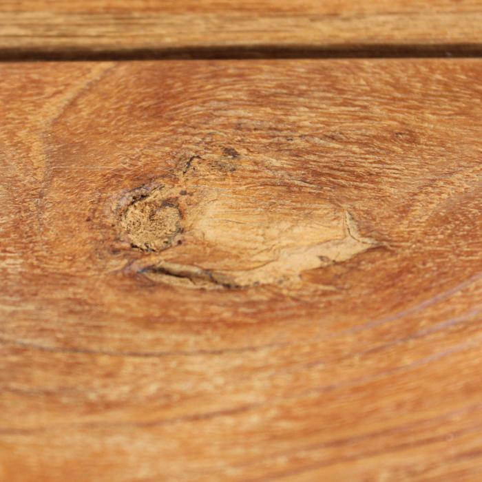 Die rustikale Holzsortierung macht den Charme des recycelten Teakholzes aus. Typisch hierfür sind Unregelmäßigkeiten durch Äste, Risse und Einlagerungen von Quarzen im gewachsenen Holz.