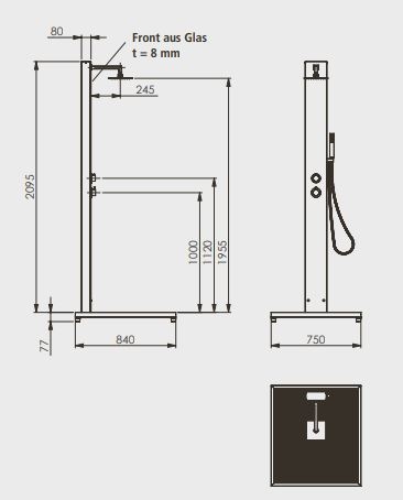 Dieses Modell zeichnet sich durch die Verwendung von hochwertigen Materialien aus: Die Säule besteht aus Edelstahl V2A und die Armaturen sind aus verchromtem Messing gefertigt. Eine Verkleidung aus Sicherheitsglas und eine Bodenplatte aus WPC-Dielen mit Edelstahlrahmen geben der Gartendusche hohen optischen Reiz. Der verchromte Kunststoff-Duschkopf und Handbrause sorgen für einen eleganten und modernen Look.