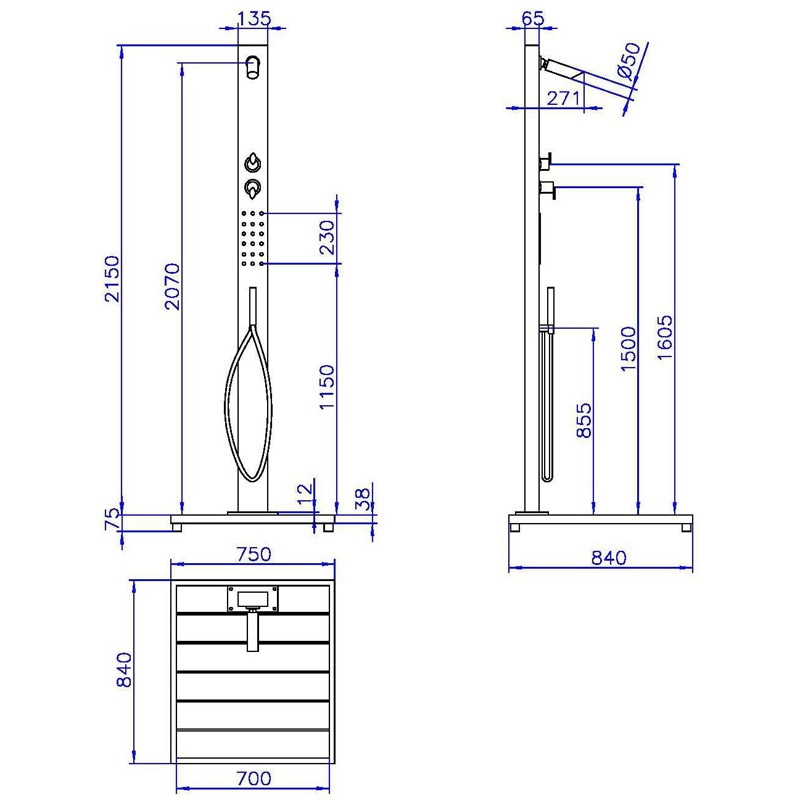 Die Ideal Gartendusche Malta überzeugt nicht nur durch ihr elegantes Design und die hochwertigen Materialien. Sie verfügt über eine Höhe von etwa 215 cm, mit einem Abstand vom Boden bis zum Duschkopf von etwa 207 cm. Zudem ist sie robust und stabil mit einem Gewicht von etwa 37 kg.