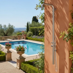 Diese exklusive Gartendusche ist sowohl für Kalt- als auch Warmwasser geeignet. Sie ist mit einem Einhebel-Mischsystem ausgestattet, um die gewünschte Wassertemperatur schnell und einfach einzustellen. Die Möglichkeit, zwischen Kopf- und Handbrause zu wechseln, sorgt für zusätzliche Flexibilität beim Duschen. Zum Lieferumfang gehört außerdem eine praktische Montagebox für den Wasseranschluss.