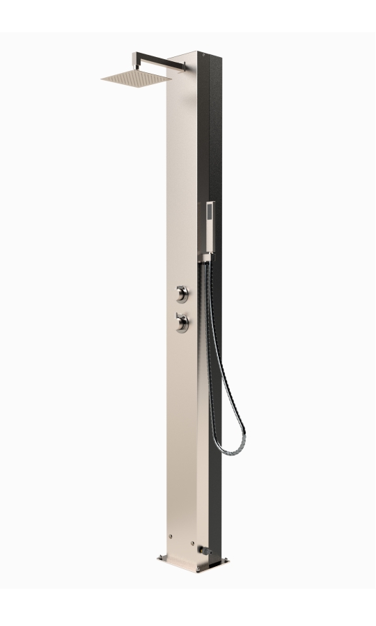 Die Gartendusche Trinidad Solar ist eine Kalt- und Warmwasser-Dusche und hat eine Höhe von 210 cm. Mit einer Höhe von 205 cm bis zum Duschkopf und einem Gewicht von 35 kg ist sie die perfekte Wahl für den Sommer! Die Gartendusche ist ausgestattet mit einer Einhebel-Mischbatterie, Handbrause, Umsteller für Kopf-Handbrause sowie einem Duschkopf. Die Duschsäule wird mittels Flanschmontage auf dem fertigen Boden befestigt.