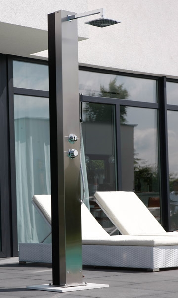 Die Ideal Gartendusche Trinidad Solar bietet Luxus und Komfort für Ihr privates Schwimmbad oder Ihren Garten. Sie ist elegant im Design und optimal in der Funktion. Der hochwertige Edelstahl V2A der Säule und der Aluminiumwasserspeicher sorgen für Langlebigkeit und Qualität. Armaturen und Duschkopf sind aus verchromtem Messing und Kunststoff gefertigt.#