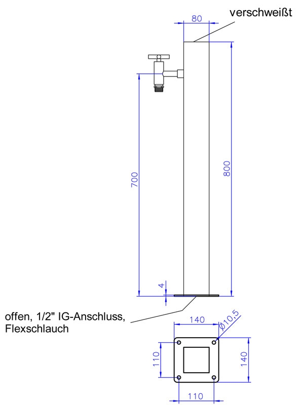 Die Befestigung erfolgt auf dem fertigen Boden auf einer Flanschplatte 140x140mm. Befestigungsdübel und Schrauben sind im Lieferumfang enthalten.