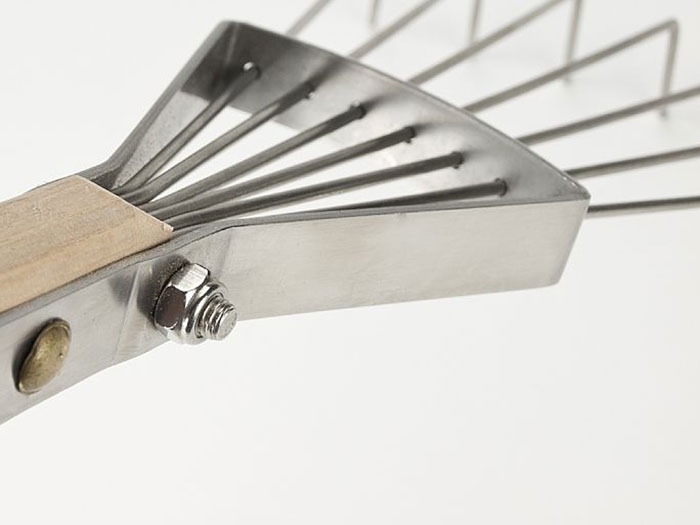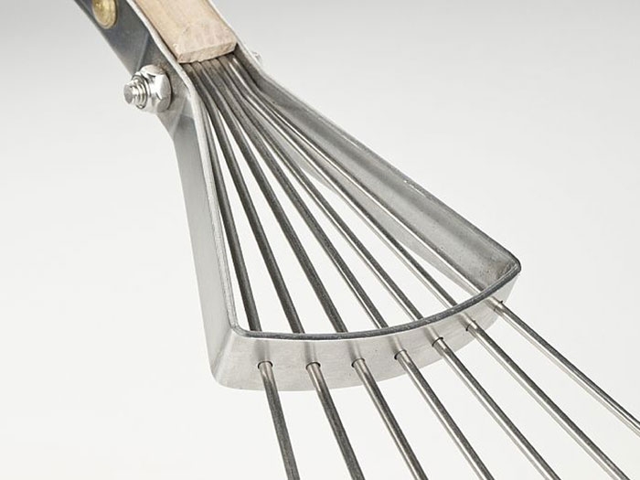 Besondere Merkmale sind sein massives, von Hand geschmiedetes und geschliffenes Edelstahlblatt und sein hochwertiger Eschenholz-Stiel. Das Blatt, aus feinstem rostfreien Edelstahl gefertigt, hat eine Höhe von ca. 23 cm und Breite von ca. 15 cm. Der Stiel aus Esche ist rund 150 cm lang und ermöglicht eine bequeme Arbeitshaltung. Die 7 Zinken des Sneeboer Laubrechens sorgen für ein sauberes Arbeiten und verhindern ein zu tiefes Eindringen in den Boden.