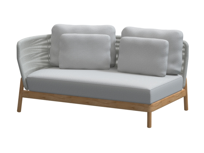 Die 4Seasons Avalon Living-Garnitur zeichnet sich durch ihr massives Teakholzgestell in natürlichem Finish aus, das eine angenehme warme Atmosphäre schafft. Ergänzt wird diese Optik durch die graue Bespannung aus Seil (Rope) und die dazu passenden grauen Polster.