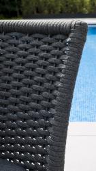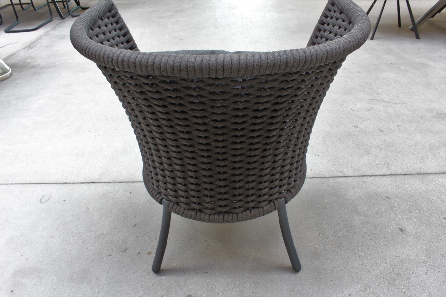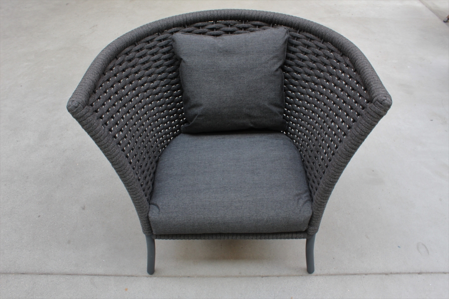 Der Loungesessel hat eine edle Bespannung aus Seil (Rope) und ein pulverbeschichtetes Aluminiumgestell. Die Farbe des Gewebes und des Gestells ist ein eleganter Grauton. So fügt sich der Sessel nahtlos in jede Balkon- und Terrassengestaltung ein.