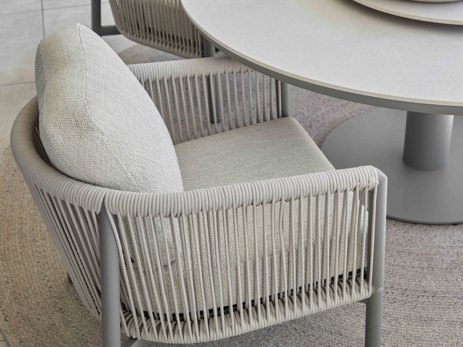 Der Kissenbezug besteht ca. 100 % Olefin. Dieses Gewebe ist für den Außeneinsatz konzipiert, farbbeständig und unkompliziert in der Pflege. Das verwendete Rope setzt sich aus ca. 100 % Polyethylen zusammen, was zu einer hohen UV-Beständigkeit und einer guten Widerstandsfähigkeit gegen Feuchtigkeit und Temperaturschwankungen führt.