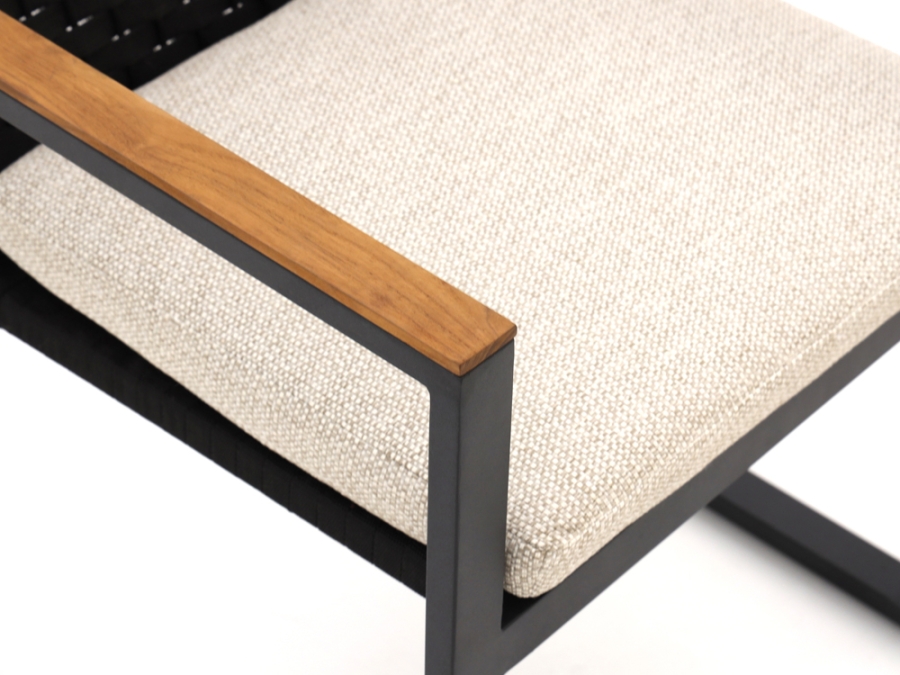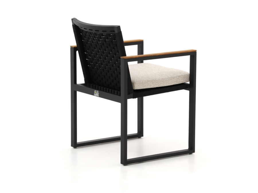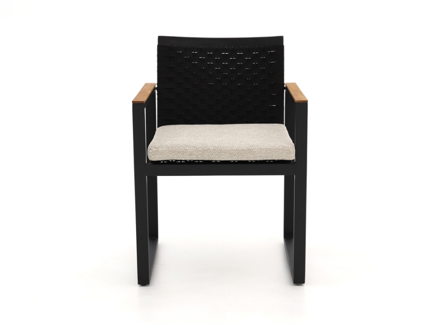Der Apple Bee Dominica Dining-Sessel präsentiert sich mit einem wasserabweisenden Kissenbezug aus Polypropylen und einem pulverbeschichteten Aluminiumgestell in schwarz, was ihm eine elegante Optik verleiht. Zudem bestehen die Armlehnen aus robustem Teakholz, und die angenehme Polsterfarbe ist Natural Oak.