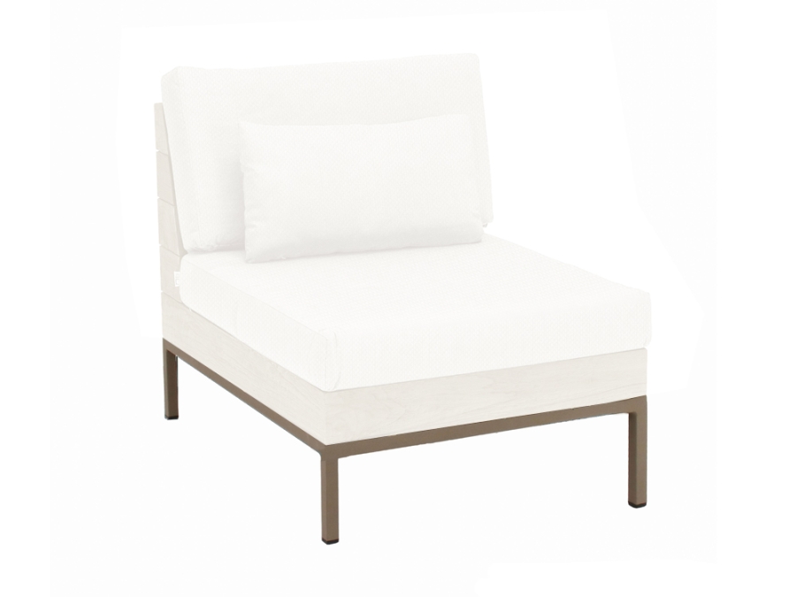 Bei dem Rahmen dieses schönen Mittelelements wurde auf Teakholz zurückgegriffen. Für das Gestell wurde eine Kombination aus Aluminium, das zusätzlich pulverbeschichtet wurde, genutzt. Die attraktive Farbkombination aus Coastal, Beige für die Polster und Taupe für das Gestell macht dieses Mittelelement zu einem besonderen Blickfang.
