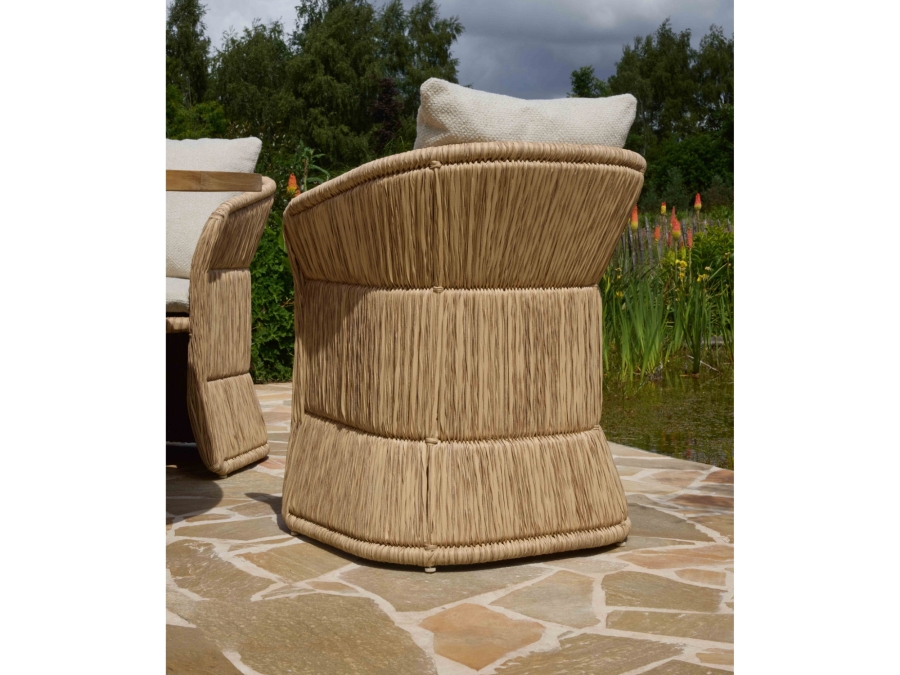 Der Apple Bee Gili Dining Sessel wird inklusive Sitz- und Rückenkissen geliefert, sodass der Gartenstuhl direkt einsatzbereit ist. Die Kissen verfügen über eine komfortable Kissenstärke von ca. 6 cm und bieten damit eine angenehme Polsterung für längere Dinnerabende. Der wasserabweisender Kissenbezug in der Farbe Boucle Cream trägt zu einer eleganten, hellen Gesamtwirkung des Dining Sessel bei und bildet einen edlen Kontrast zum Geflecht. Die Kissen lassen sich bei Bedarf von Hand mit mildem Waschmittel und einer Bürste reinigen, wodurch der Pflegeaufwand gering bleibt und der Gartenstuhl lange seine gepflegte Optik behält. Dank der Quick-Dry-Foam-Füllung kehren die Kissen nach einem Regenschauer rasch in einen nutzbaren Zustand zurück.