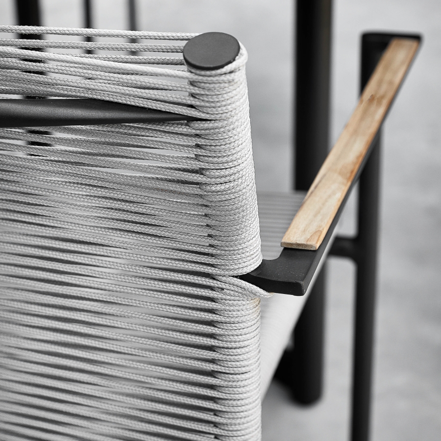 Das Apple Bee Jakarta Dining-Set 4 grey überzeugt durch eine durchdachte Materialwahl für den Einsatz im Freien. Das Gestell besteht aus pulverbeschichtetem Aluminium in schwarzer Ausführung. Dieses Material ist leicht, stabil und korrosionsbeständig, was sich besonders bei wechselnden Witterungsbedingungen bewährt. Die Armlehnen sowie die Tischplatte sind aus Teakholz gefertigt. Teak ist ein bewährtes Holz für Outdoor-Möbel, da es von Natur aus robust ist und mit der Zeit eine charakteristische Patina entwickeln kann. Die Sitz- und Rückenflächen der Stühle sind mit einer Rope-Bespannung in Grau versehen. Diese Bespannung besteht zu etwa 100 Prozent aus Polypropylen und ist damit witterungsbeständig, strapazierfähig und gleichzeitig angenehm im Sitzkomfort.