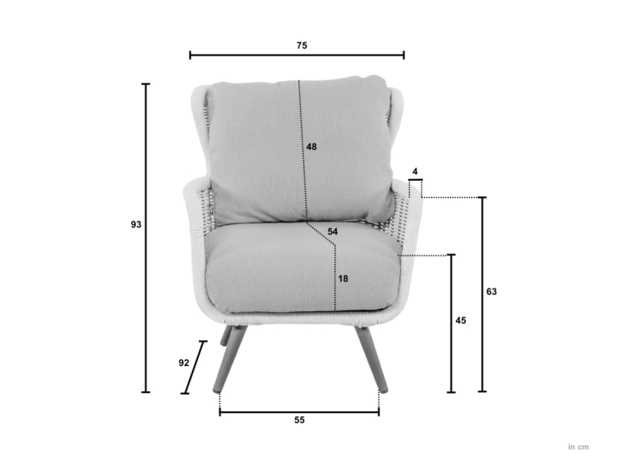 Die Bemassung des Apple Bee Key Largo Lounge Sessel ist auf komfortables Sitzen und entspanntes Zurücklehnen ausgelegt. Mit einer Gesamtbreite von ca. 75 cm, einer Gesamttiefe von ca. 92 cm und einer Gesamthöhe von ca. 93 cm bietet der Loungesessel ausreichend Platz, ohne zu viel Raum auf Terrasse oder Balkon einzunehmen. Die Sitzhöhe von ca. 45 cm ermöglicht ein bequemes Sitzen und leichtes Aufstehen, während die Armlehnenhöhe von ca. 63 cm für eine entspannte Armauflage sorgt. Damit lässt sich der Apple Bee Key Largo Lounge Sessel optimal mit weiteren Loungeelementen wie [[Lounge Hocker]] kombinieren.