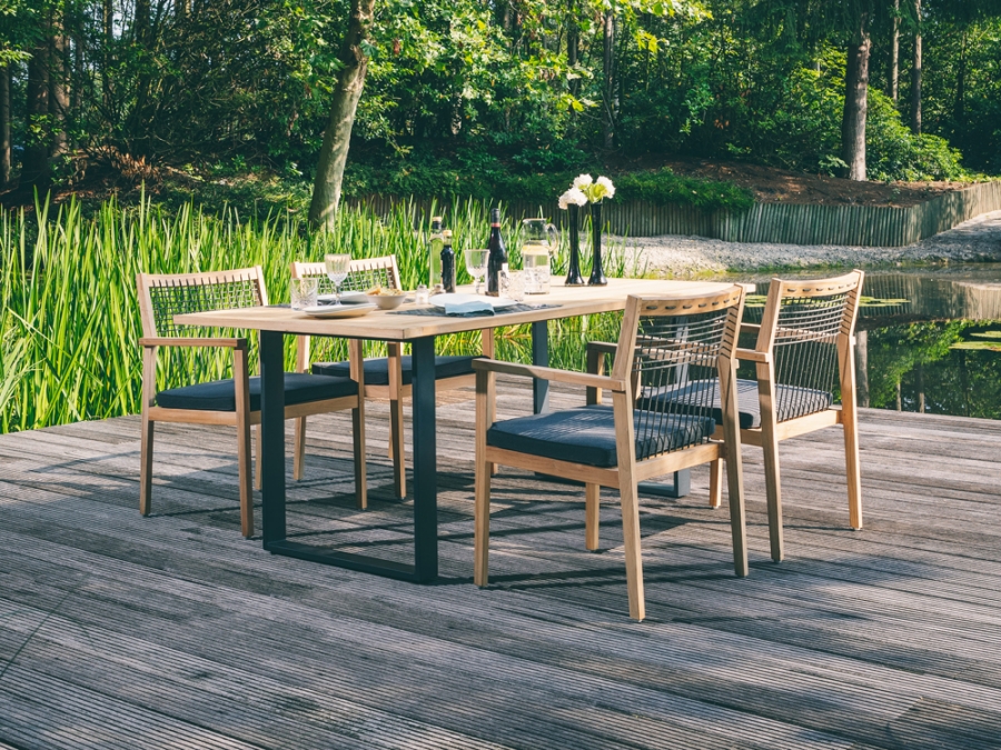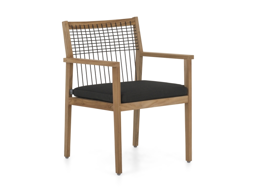Die edle Kombination aus Teakholz und Polypropylen verleiht dem Apple Bee La Croix Armlehnstuhl seine ganz besondere Ausstrahlung. Das Teakholz-Gestell und die Armlehnen sind nicht nur ästhetisch ansprechend, sondern auch besonders stabil und langlebig. Das schwarz bespannte Seil (Rope) gibt dem Armlehnstuhl zudem eine außergewöhnliche Note. Die Polsterfarbe in Schwarz unterstreicht das elegante Design.