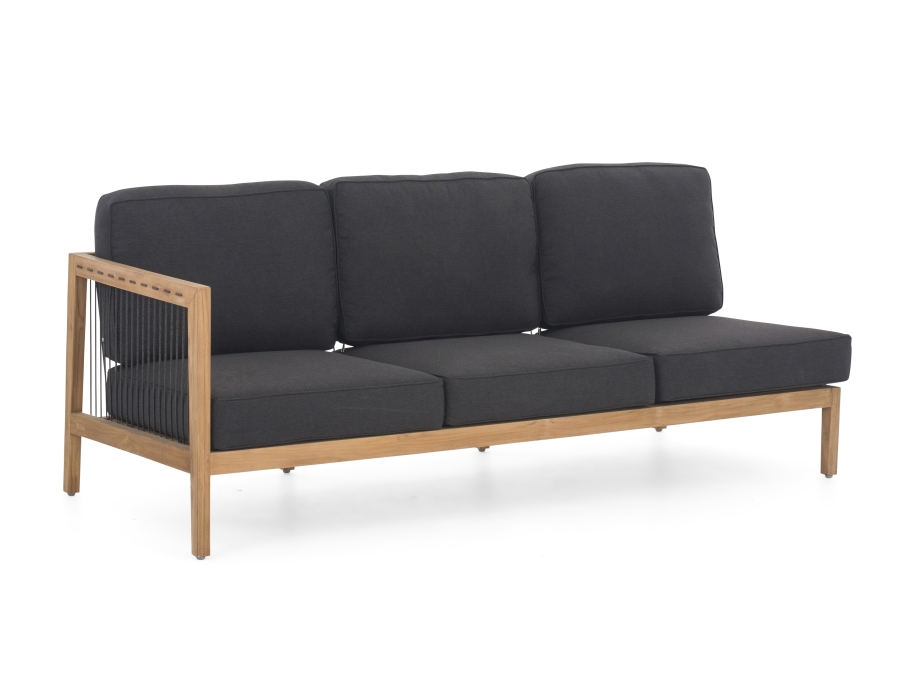 Die Besonderheit dieses Sofas liegt in der Auswahl und Verarbeitung der Materialien. Für das Gestell wurde hochwertiges Teakholz verwendet, das durch seine Natürlichkeit und Langlebigkeit überzeugt. Die Bespannung des Sofas besteht aus Seil (Rope), einem Material, das nicht nur für seine Robustheit und Langlebigkeit, sondern auch für seine UV-Beständigkeit und Wetterfestigkeit geschätzt wird. Die Polsterfarbe Schwarz sorgt für einen modernen und gleichzeitig zeitlosen Look. Abgerundet wird das elegante Design durch Armlehnen aus Teakholz.