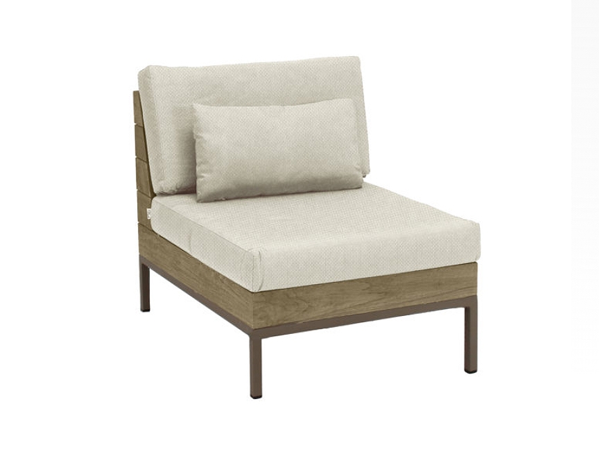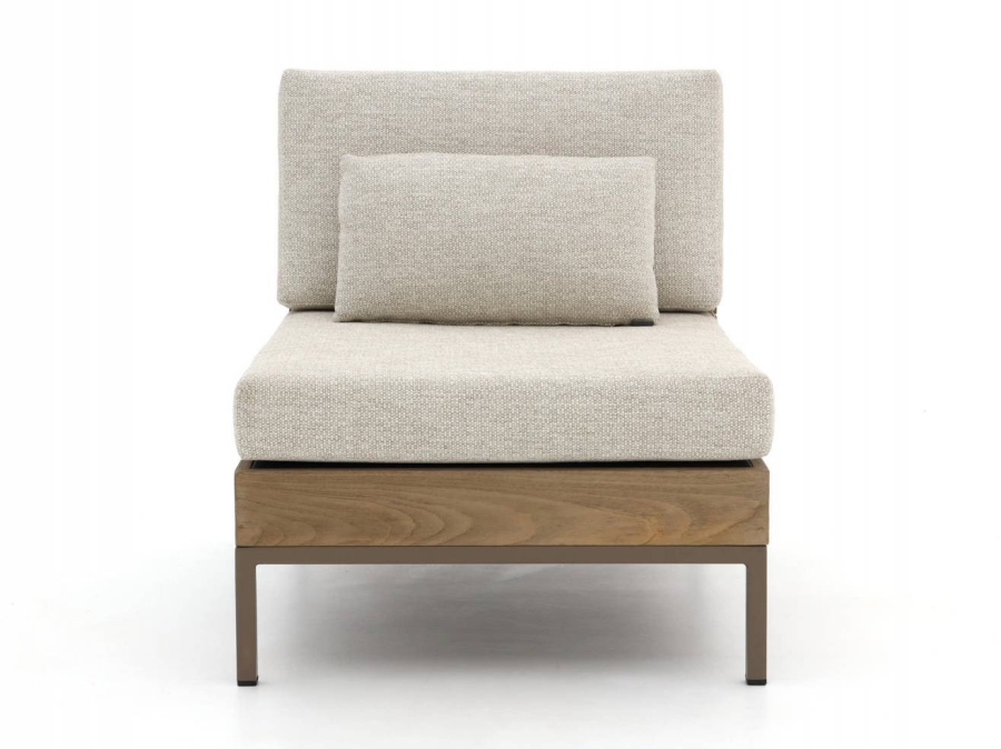 Bei dem Rahmen dieses schönen Mittelelements wurde auf Teakholz zurückgegriffen. Für das Gestell wurde eine Kombination aus Aluminium, das zusätzlich pulverbeschichtet wurde, genutzt. Die attraktive Farbkombination aus Coastal, Beige für die Polster und Taupe für das Gestell macht dieses Mittelelement zu einem besonderen Blickfang.