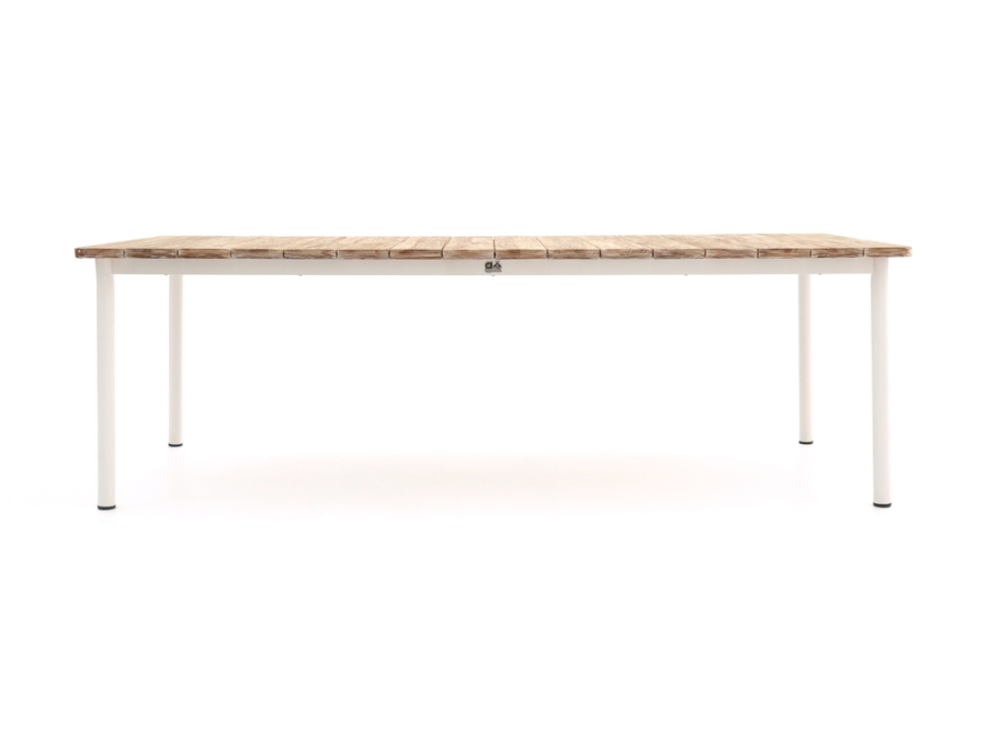 Beim Materialmix des Gartentisches fehlt es keineswegs an Qualität. Das konturgenaue, pulverbeschichtete Aluminiumgestell liefert genügend Stabilität, um allen Anforderungen standzuhalten, während die Teakholz-Tischplatte in white wash-Farbe für eine charmante Ästhetik sorgt. Das Weiß des Gestells und der Tischplatte korrespondieren wunderbar miteinander und bieten ein harmonisches Gesamtbild.