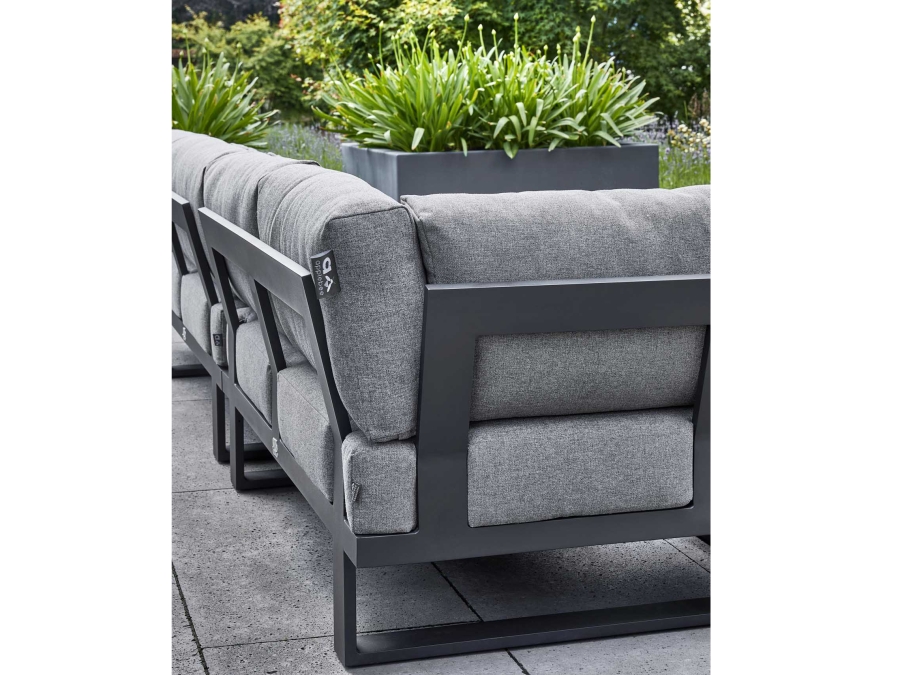 Die Apple Bee Mura Black Loungegarnitur besteht aus einem Loungetisch, einem Sofa mit Ablage rechts, einem Sofa mit Ablage links, sowie einem Sofa mit Armlehne rechts. Diese Bestandteile sind perfekt aufeinander abgestimmt und bilden zusammen eine harmonische Loungemöbel-Landschaft. Die Tabletts aus Teakholz sind nicht fest mit der Tischplatte verbunden und lassen sich auch anderweitig nutzen, was der Kombination eine zusätzliche Funktionalität und Flexibilität verleiht.