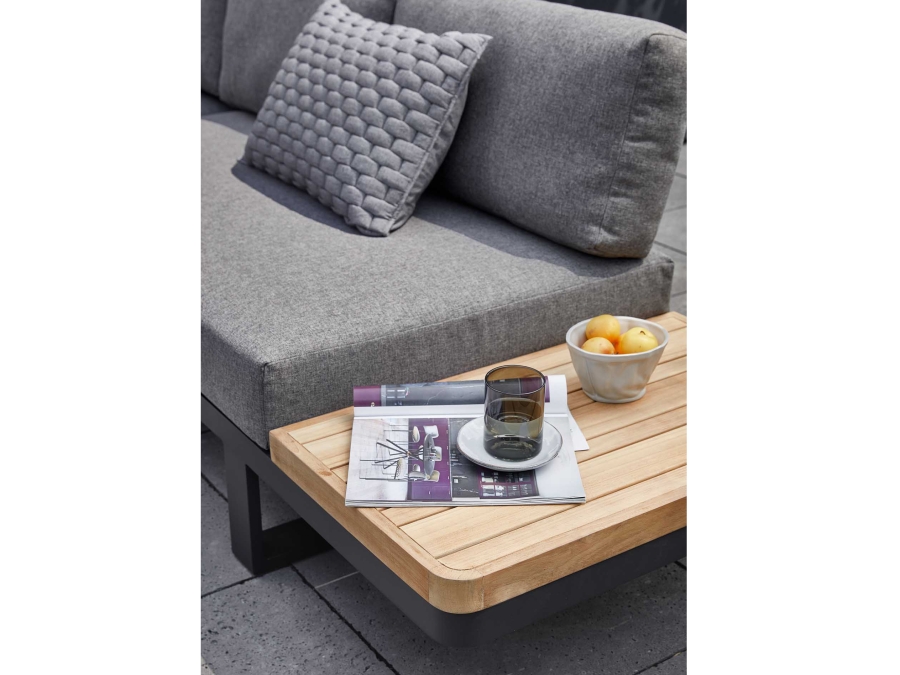 Eine sorgfältige Auswahl an Materialien kennzeichnet das Mura Loungesofa von Apple Bee. Das Aluminiumgestell ist robust und langlebig, während die Tischplatte aus Teakholz einen Hauch von Natürlichkeit verleiht. Komplettiert wird das Design des Sofas durch Polsterbezüge aus Polypropylen, die gleichzeitig bequem und witterungsbeständig sind. Nicht zu vergessen ist die linke Ablage, die sich hervorragend als Beistelltisch für Zeitschriften oder Snacks anbietet und zusätzlichen Komfort bietet.