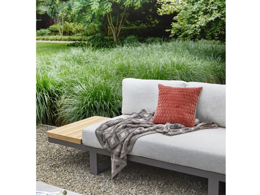 Die Qualität der Materialien hat direkte Auswirkungen auf die Langlebigkeit und Wartungsfreundlichkeit eines Produkts. Das Loungesofa hat ein Gestell aus Aluminium, das langlebig und widerstandsfähig gegen Witterungseinflüsse ist. Die wunderbar verarbeitete Tischplatte aus Teakholz fügt eine luxuriöse Note hinzu. Die Kissenbezüge bestehen aus ca. 100 % Polypropylen und die Polsterfarbe Natural Oak verleiht dem Loungesofa ein erfrischendes Aussehen. Das Sofa ist taupe pulverbeschichtet und bietet daher Schutz vor Rost und Kratzern.