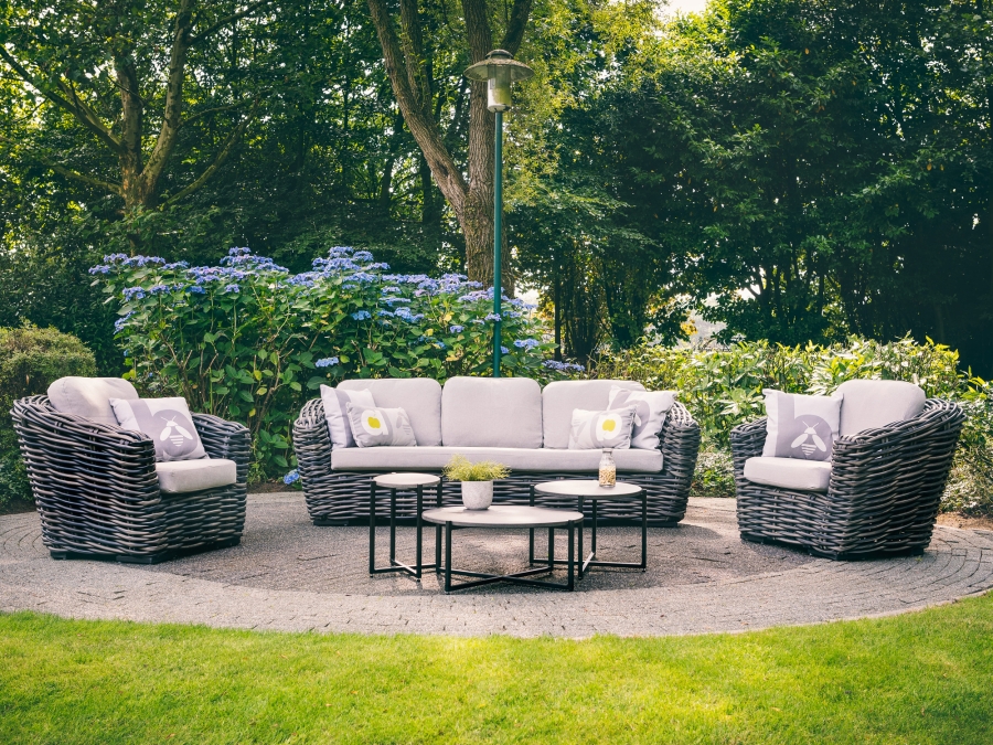 Hochwertige Materialien zeichnen das Palm Bay Sofa von Apple Bee aus. Das Sofa verfügt über ein solides Aluminiumgestell und ist mit einem strapazierfähigen Poly-Rattan-Bespannung versehen. Dieses Material ist nicht nur optisch ansprechend, sondern auch besonders langlebig und widerstandsfähig. Die attraktive Geflechtfarbe Black Wash und die graue Polsterfarbe verleihen dem Sofa seinen edlen Charakter.