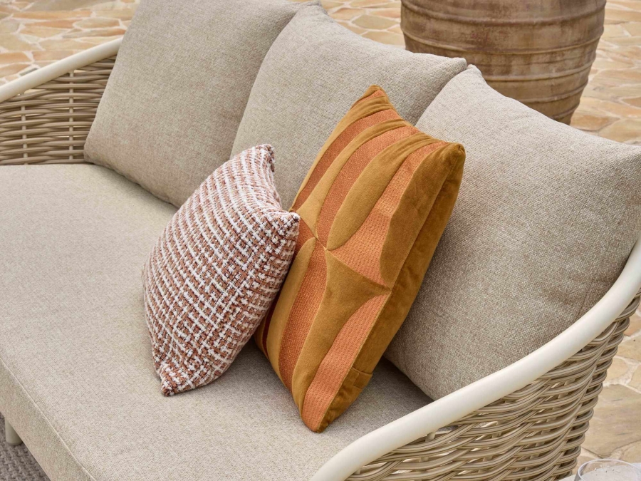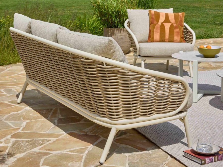 Beim Loungesofa Pine Key sind die passenden Polster bereits im Lieferumfang enthalten. Sie erhalten das komplette 3-Sitzer Sofa inklusive Sitz- und Rückenkissen in der abgestimmten Polsterfarbe Cotton Flower. Die Kombination aus Polyrattan-Geflecht seashell, Aluminium-Gestell Oyster und den dazu passenden Textilien sorgt für ein direkt einsatzbereites Loungemöbel, das ohne zusätzliche Anschaffungen genutzt werden kann.