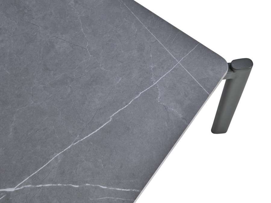 Bei diesem Kaffeetisch kommen hochwertige Materialien zum Einsatz. Die Tischplatte ist aus Stein gefertigt und präsentiert sich in einem dunkelgrauen Dekor. Das Gestell besteht aus anthrazit matt pulverbeschichtetem Edelstahl und verleiht dem Tisch Stabilität und Robustheit.