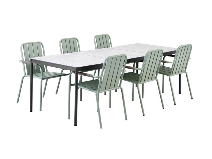 Die Brafab Nox-Innes Sitzgruppe-3 besteht aus insgesamt neun Teilen. Im Zentrum steht ein stabiles Tischgestell aus Aluminium in der Farbe Anthrazit mit den Maßen 237x90 cm. Darauf werden zwei separate HPL-Tischplatten in Terrazzo beige montiert: eine Platte mit 79x90 cm und eine Platte mit 158x90 cm. Gemeinsam bilden sie eine großzügige Tischfläche, die ausreichend Platz für Speisen, Getränke und Dekoration bietet. Ergänzt wird das Gartenmöbel-Set durch sechs Innes Diningstühle in der Farbvariante Dusty green, die optisch perfekt auf das Tischensemble abgestimmt sind. Diese Konfiguration macht die Brafab Nox-Innes Sitzgruppe-3 zu einer praktischen Lösung für den Familienalltag ebenso wie für gesellige Runden mit Gästen.