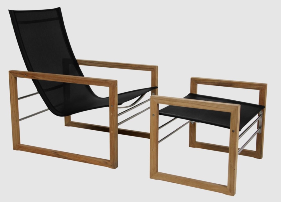 Das markante Gestell des Loungesessels besteht aus hochwertigem Teakholz, welches durch Edelstahl-Streben ergänzt wird. Für hohen Sitzkomfort sorgt zudem die schwarze Textilbespannung.