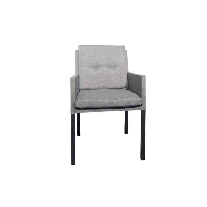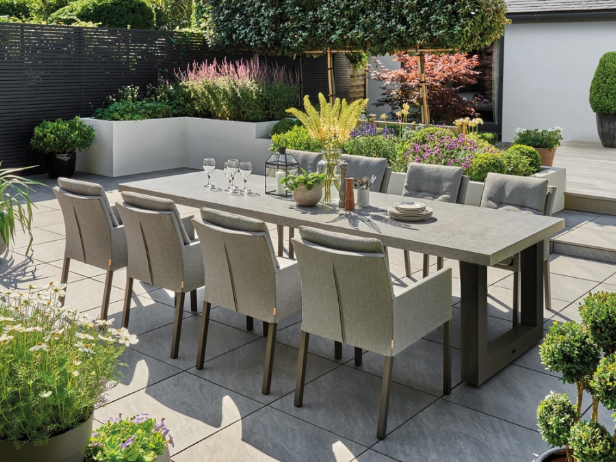 Die Essgruppe besteht aus Metall und Aluminium. Die Allweather Bezüge aus Mist grey der Stühle harmonieren wunderschön mit der 6 cm dicken Keramiktischplatte in Betonoptik des Stelvio Tisches. Die beeindruckende Pulverbeschichtung des Aluminiums schützt das Material und erhöht die Langlebigkeit des Sets erheblich. Das pflegeleichte Set mit klaren Linien und ihre Bedeutung für ein komfortables Esserlebnis haben einen hervorragenden Einfluss auf Ihre Outdoor-Aktivitäten.