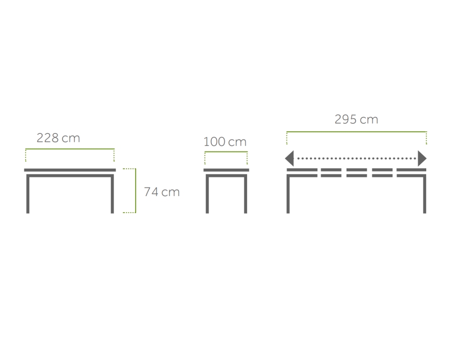 Der MWH Alutapo Gartentisch bietet großzügige Abmessungen, die ihn perfekt für größere Gesellschaften machen. Mit einer Gesamtbreite von ca. 228 cm und einer zweiten Gesamtbreite von ca. 295 cm sowie einer Gesamttiefe von ca. 100 cm und einer Gesamthöhe von ca. 74 cm ist er sowohl funktional als auch komfortabel.