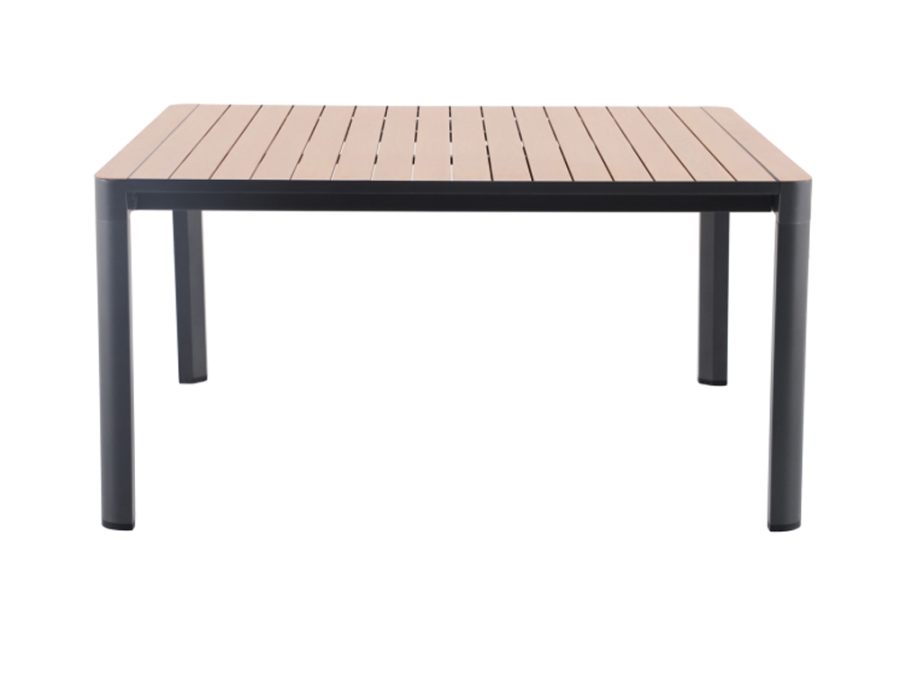 Das Gestell des Tisches besteht aus langlebigem Aluminium. Die Oberfläche ist Elotherm® beschichtet und schützt den Tisch vor den Elementen. Die Gestellfarbe in Eisengrau verleiht ihm ein modernes und stilvolles Aussehen. Die Tischplatte aus Aluminium im Holzoptik-Design verbindet die robuste Struktur mit der Ästhetik natürlicher Materialien.