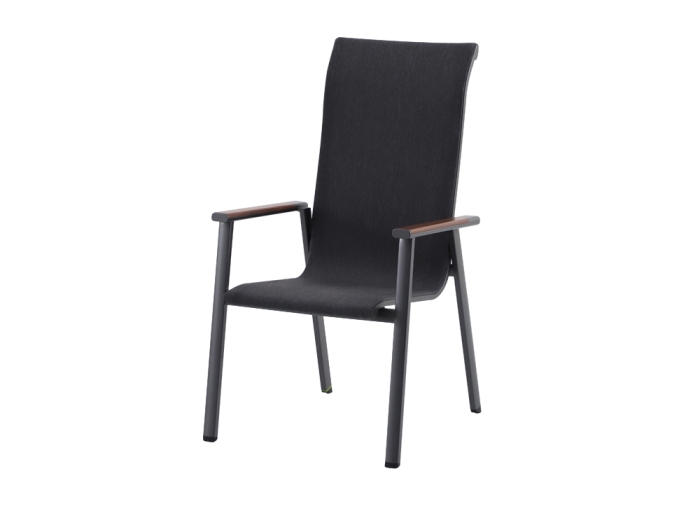 Das Gestell der Prado Serie besteht aus hochwertigem Aluminium, das dank einer speziellen Elotherm®-Beschichtung besonders widerstandsfähig ist. Die Tischplatte besteht aus langlebigem High Pressure Laminate (HPL) in edlem Grau, während die Armlehnen eine ansprechende Mahagoni-Holzoptik aufweisen. Das Gewebe der Bespannung ist aus ca. 100 % Polyester gefertigt und in eleganten Anthrazit-Tönen gehalten. Diese Materialien sorgen für Wetterbeständigkeit und UV-Beständigkeit.