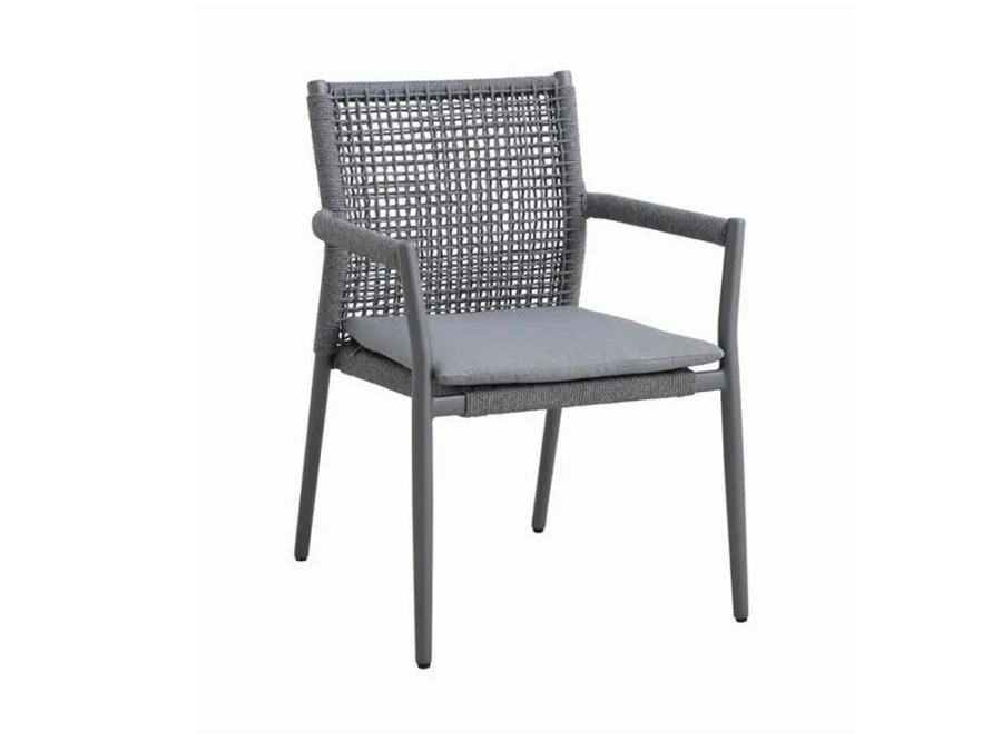 Der MWH Stapelstuhl Ropero besteht aus hochwertigen Materialien. Die Bespannung ist aus robustem Rope gefertigt und in einer eleganten Farbe Anthrazit gehalten. Das Gestell besteht aus langlebigem Aluminium und ist Elotherm®-beschichtet, was dem Stuhl eine extra Schutzschicht verleiht. Die Armlehnen in Holzoptik ergänzen das Gesamtbild stilvoll, während der Polsterbezug aus speziellem Outdoor-Gewebe in einem hellgrauen Farbton gefertigt ist.