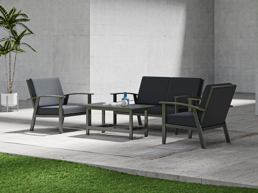 Das Gestell des Lounge-Sets besteht aus robustem Aluminium und ist mit einer widerstandsfähigen Elotherm® Beschichtung versehen. Diese Beschichtung sorgt nicht nur für eine edle Optik, sondern schützt das Möbelstück auch zuverlässig vor Rost. Der Polsterbezug besteht aus einem pflegleichten und witterungsbeständigen Outdoor-Gewebe, das zu 100 % aus Polyester gefertigt ist.