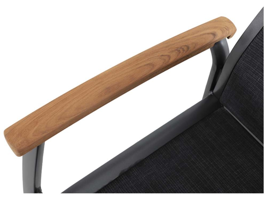 Das Gestell des Gartenstuhls besteht aus robustem Aluminium und ist mit einer hochwertigen, Elotherm Oberfläche versehen, die in der Farbe Iron Grey gehalten ist. Diese Kombination garantiert einen starken Schutz vor Witterungseinflüssen und verleiht dem Stuhl eine moderne Optik. Bereichernd für das Design und die Funktionalität sind die Armlehnen, die mit edlem Teakholz versehen sind, was nicht nur eine natürliche Haptik, sondern auch Langlebigkeit sicherstellt. Die Bespannung besteht zu ca. 100 % aus Polyester, das in seiner robusten Form hervorragend zum Einsatz kommt.