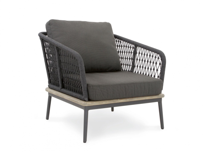 Das Gartenmöbel-Set von Niehoff fällt durch seine Bespannung aus Kordelgeflecht und dem Gestell aus pulverbeschichtetem Aluminium in der Farbe Anthrazit auf. Die Tischplatte ist ebenfalls in der Farbe Anthrazit gehalten, was eine harmonische Gesamtoptik schafft. Die Polster in der Farbe Charcoal bieten einen angenehmen Kontrast und sind zu 100% aus Polyacryl gefertigt. Akzentuiert wird das Ganze durch ausgewählte Teakelemente aus Plantagen-Teakholz.
