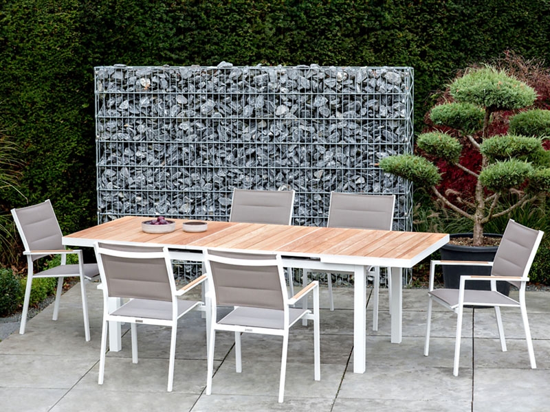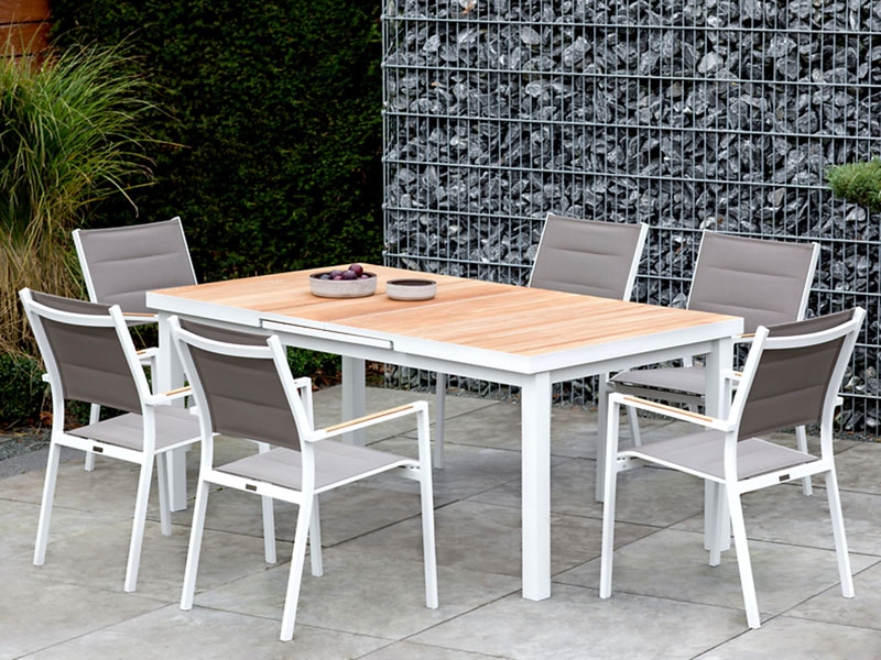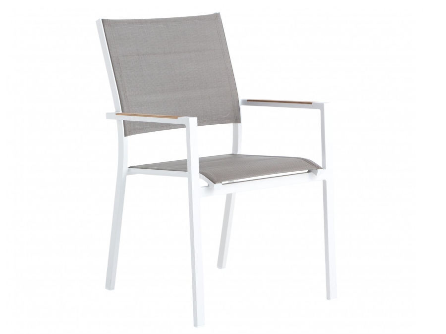 Gefertigt wird der Armlehnstuhl Nantes mit einer hochwertigen Textil-Bespannung und einem Gestell aus pulverbeschichtetem Aluminium in eleganter weißer Farbe. Zur Komplettierung des erlesenen Designs ist das Möbelstück mit Armlehnen, eingelassenem Teakholz, ausgestattet und das Gewebe überzeugt durch die Farbe Taupe.