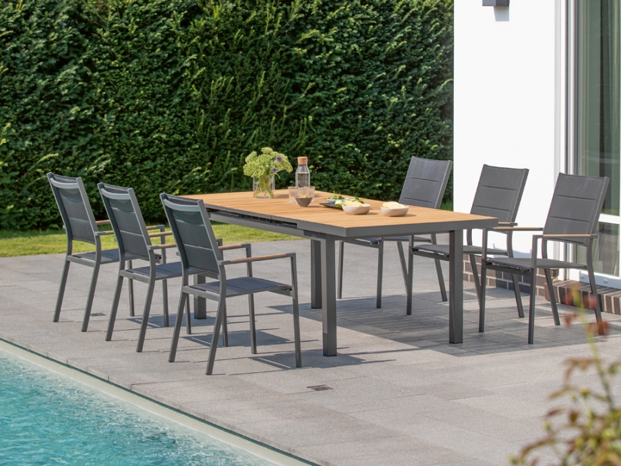 Der im Set enthaltene Ausziehtisch aus der Serie Nantes verfügt über eine Länge von 180 bis 240 cm bei einer Breite von 100 cm und ist damit ideal für gesellige Runden geeignet. Die gebürstete Teakholz-Tischplatte bildet einen warmen Kontrast zum schwarzen Untergestell und passt hervorragend zu weiteren Artikeln wie [[Nantes Stapelsessel]] oder [[Nantes Balkonset]]. Dank der Ausziehfunktion lässt sich die Niehoff Nantes Dining-Sitzgruppe, 7-teilig flexibel an Ihre Gästezahl anpassen und bietet sowohl im Alltag als auch bei besonderen Anlässen ausreichend Tischfläche.