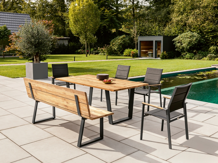 Die Gestelle dieses Gartenmöbel-Sets bestehen aus robustem, pulverbeschichtetem Aluminium in gedämpftem Anthrazit. Dieses Material sorgt für hohe Stabilität bei gleichzeitig moderatem Gewicht und unterstreicht die moderne, hochwertige Anmutung der Niehoff Nova-Noah-Revent Sitzgruppe. Sitzfläche und Rückenlehne der Bank Nova sowie die Tischplatte des Noah Tisches sind aus edlem Teak beziehungsweise recyceltem Teakholz gefertigt. Diese Holzart ist für ihre Widerstandsfähigkeit und ihre warme Farbgebung bekannt und passt ideal zu zeitgemäßen Outdoor-Konzepten. Die Kombination aus Holz, Metall und Aluminium schafft eine langlebige, pflegeleichte und wetterfeste Basis für den Einsatz im Freien.