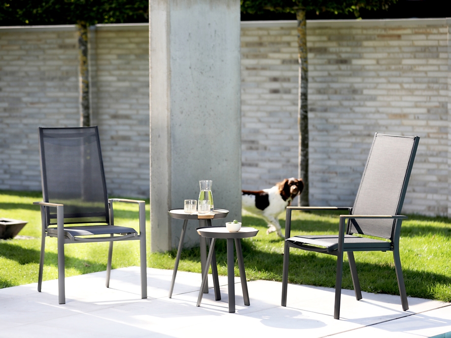 Durch die Kombination aus zwei verstellbaren Hochlehnern und zwei Beistelltischen eignet sich dieses Gartenmöbel-Set besonders für den Einsatz auf Balkonen, kleineren Terrassen oder geschützten Gartenbereichen. Die flexible Höhenstaffelung der Salvo Tische unterstützt unterschiedliche Nutzungsszenarien vom entspannten Lesen bis hin zur kleinen Kaffeepause. Optisch fügt sich das Set dank des anthrazitfarbenen Gestells und der klaren Linienführung in moderne wie auch klassische Umgebungen ein und lässt sich problemlos mit weiteren Produkten wie [[Gartenbank]] oder [[Stapelsessel]] kombinieren.