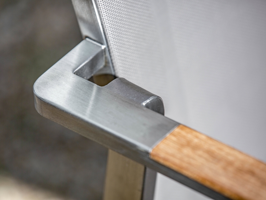 Der Niehoff Scalea Hochlehner ist ein Gartenstuhl par excellence. Gefertigt von der renommierten Marke Niehoff Garden, stammt dieser Stuhl aus der Serie Scalea und besticht durch sein geradliniges, trendiges Design. Sein robustes Gestell aus gebürstetem Edelstahl und eine fein gewebte, halbtransparente Bespannung aus Textil-Gewebe in taupe machen ihn zu einem langlebigen und eleganten Begleiter für Ihren Outdoor-Bereich. Ein besonderes Highlight sind die originellen Armlehnen, welche mit eingelassenem Teakholz arbeiten und somit einen wundervollen Akzent setzen.s