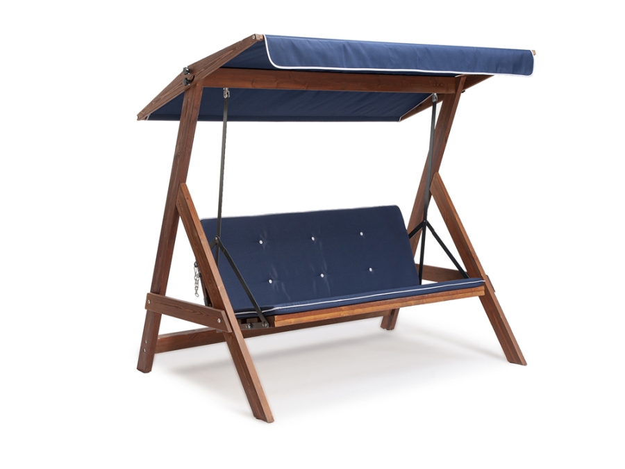 Ihr Gestell besteht aus robustem Kiefernholz, das lackiert und lasiert wurde, in einem warmen Braunton, der die Natürlichkeit des Holzes hervorhebt. Das Sonnendach und die Auflagen in Ozeanfarbe sind abnehmbar, waschbar und UV-beständig was einen hohen Komfort und Langlebigkeit gewährleistet.