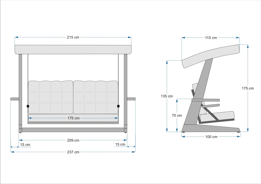 Die Hollywoodschaukel Viva 2400 besitzt eine Gesamtbreite von rund 237 cm, eine Gesamttiefe von etwa 100 cm (2. Gesamttiefe: ca. 115 cm) und eine variable Gesamthöhe von 135 bis 175 cm. Mit einer Sitzbreite von ca. 175 cm bietet sie ausreichend Platz für bis zu vier Personen. Das Produkt wiegt zirka 64,5 kg und hält eine maximale Belastung von bis zu 300 kg aus, was eine hohe Stabilität garantiert.