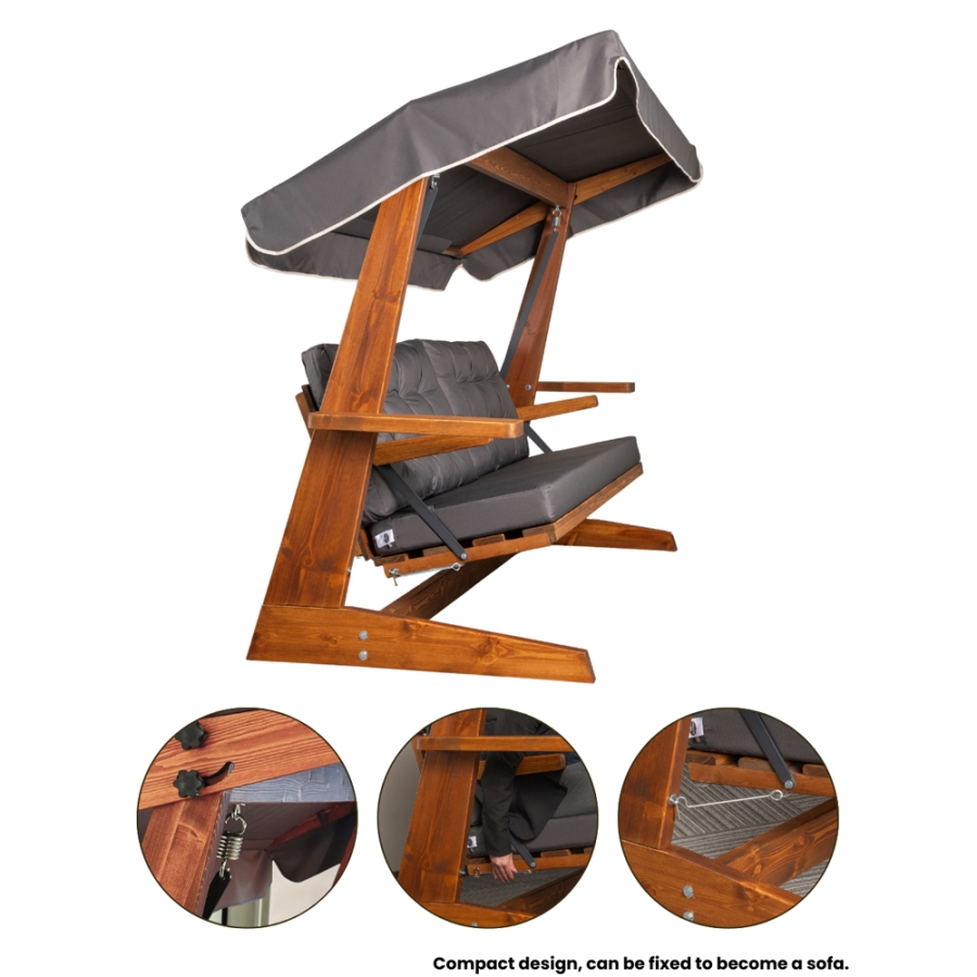 Nicht nur der Ausdruck von Eleganz und Exklusivität, sondern auch das außergewöhnliche Komforterlebnis macht den Charme dieser Hollywoodschaukel aus. Ihr stabiles Gestell aus Fichte und Kiefernholz, in ansprechendem Braunton gehalten, verleiht dem Produkt sowohl die notwendige Stabilität als auch ein attraktives Design. Das Gestell harmoniert perfekt mit der Farbgebung des abnehmbaren, schwenkbaren und UV-Schutz bietenden Sonnendachs, sowie der Polster, die beide aus Outdoor-Gewebe in elegantem Anthrazit gefertigt sind.